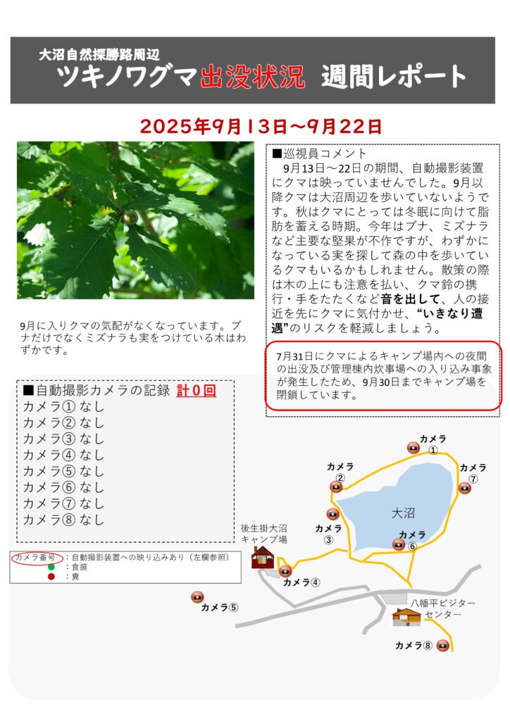 八幡平ビジターセンターが位置する大沼後生掛地区では7月~10月ツキノワグマの出没状況を把握するためのパトロールを行っています。