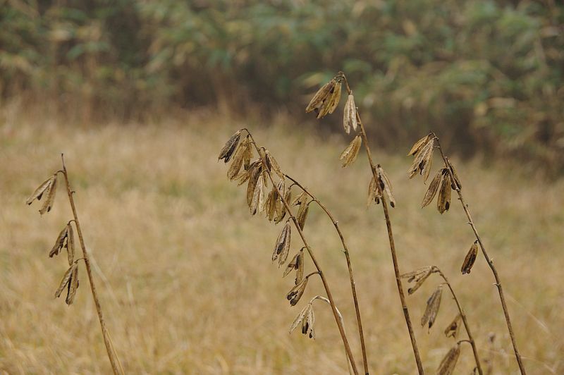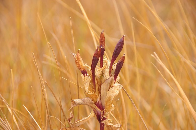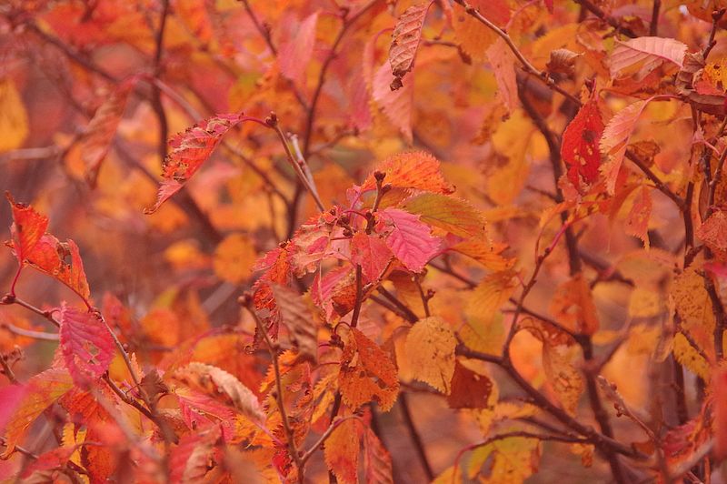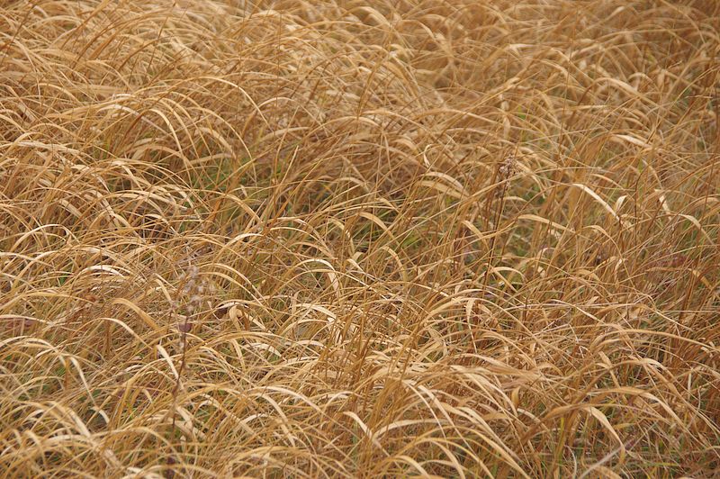 八幡沼湿原の草紅葉はまだ見頃が続いています。草紅葉は全体としてはオレンジ色ですが、少し色が薄くなったヌマガヤの葉や、黒い種をぶら下げるタチギボウシなど、さまざまな植物が微妙な濃淡で秋の湿原を彩っています。