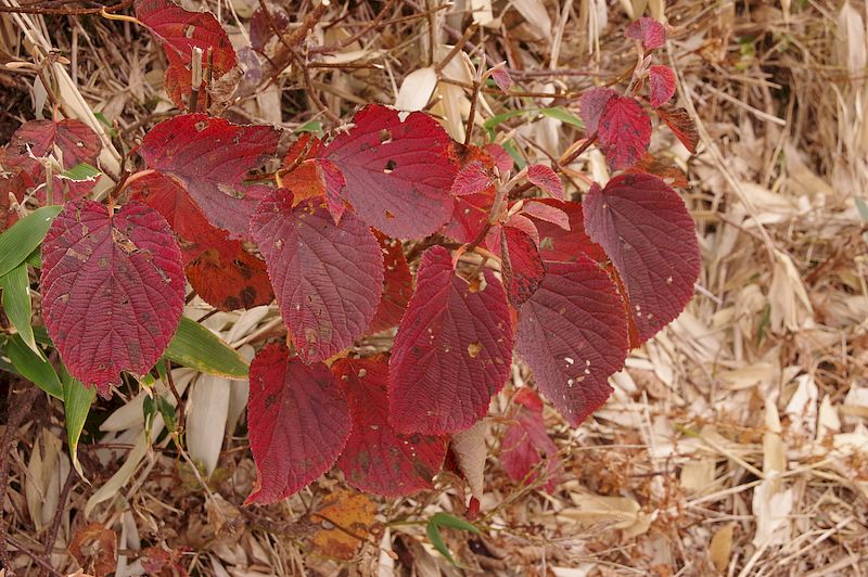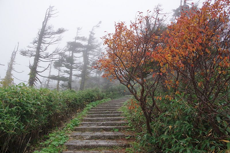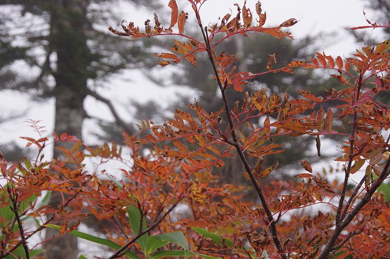 石畳歩道沿いなど樹林帯の紅葉は、オオシラビソやササの緑のなかに灌木類(オオカメノキ、ミネザクラ、ウラジロナナカマド、ミネカエデ)が鮮やかです。ただ灌木類の紅葉は少しピークを過ぎつつあり、落葉している木も目立ってきています。