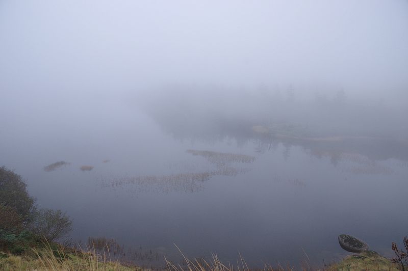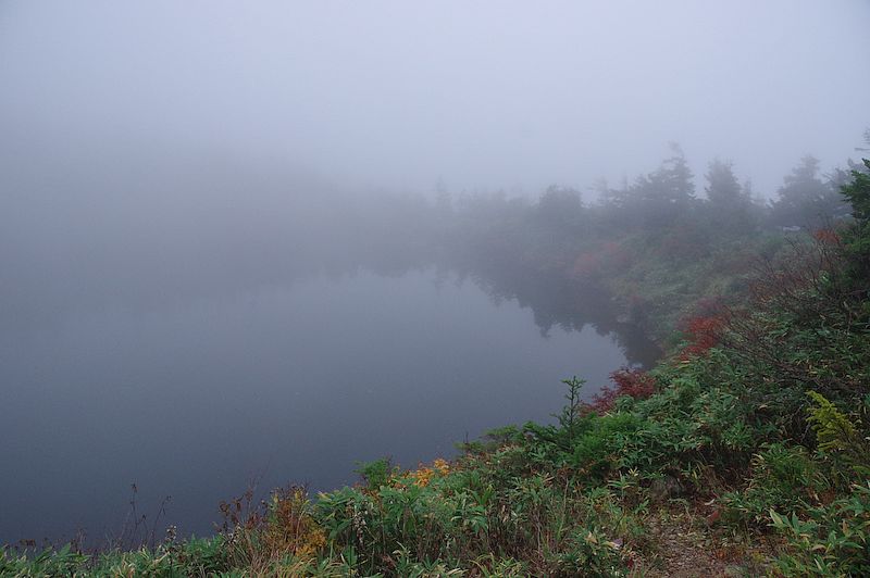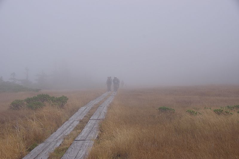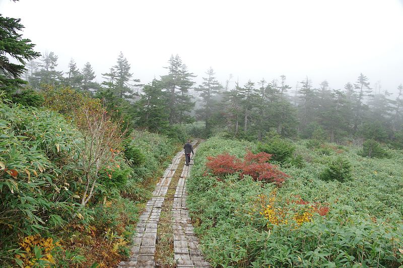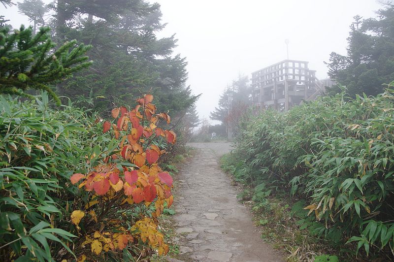 八幡平山頂展望台。指導標300番が霧の中にうっすら見えています。冬期、樹氷見物の登山者が山頂の目印として利用しています。
