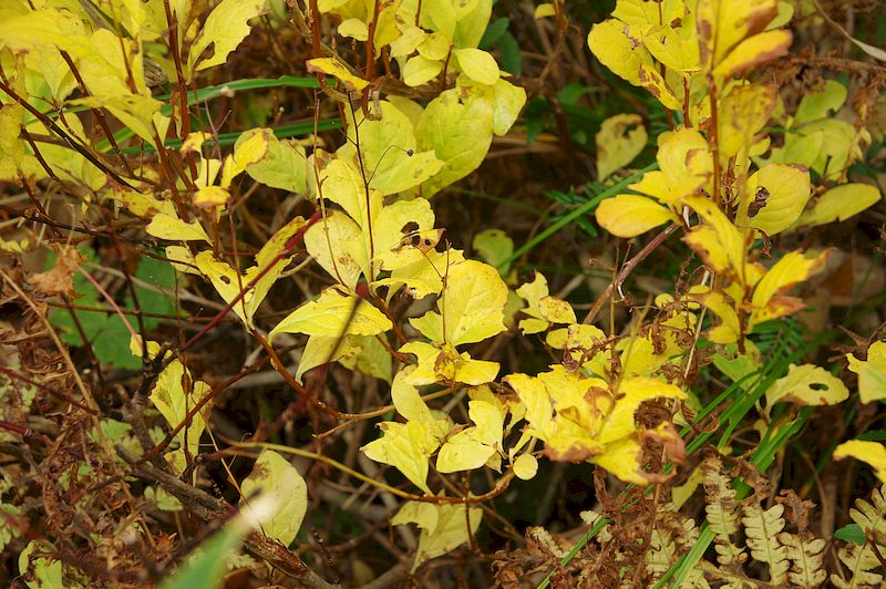 駐車場へ戻る石畳歩道沿い。枯れた立木についたツルアジサイの黄葉がとても目立っていました。