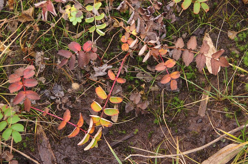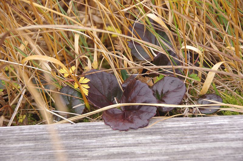 濃い赤に色づいた葉はイワカガミ、黄色の小さいはシラネニンジン