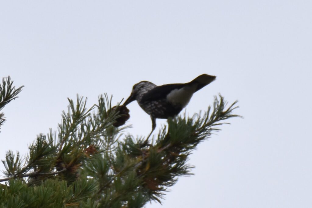 ホシガラスが松ぼっくりを啄んでいました。朝から鳴き声が聞こえていましたが、人の気配が無くなったタイミングで姿を現してくれました。