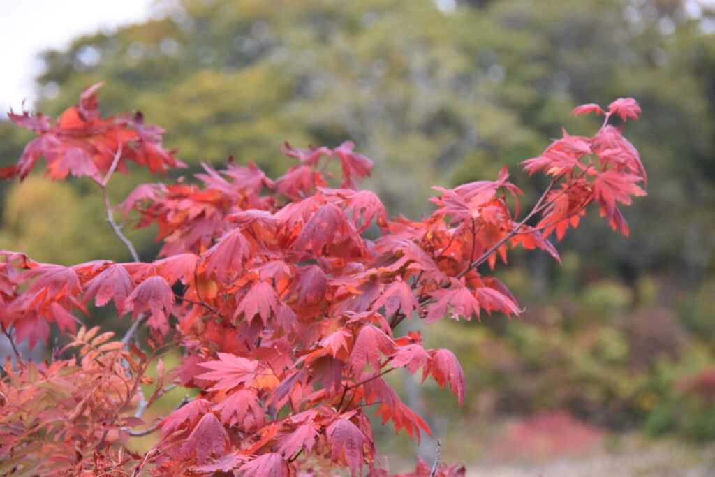赤く色づいていたレンゲツツジやヤマウルシなどは落葉が始まっていて、オオカメノキや画像のハウチワカエデなどが、秋らしく赤く色づいています。