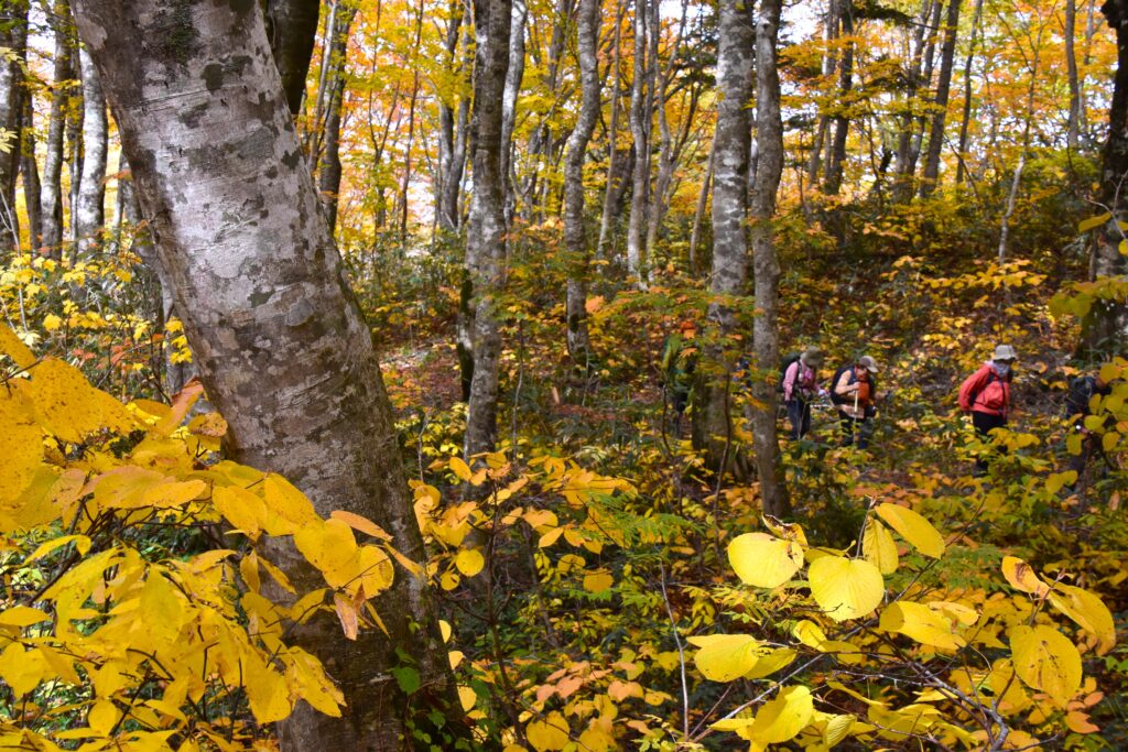 ブナだけでなく、林床の低木類も黄色く色付く中をゆっくりと。