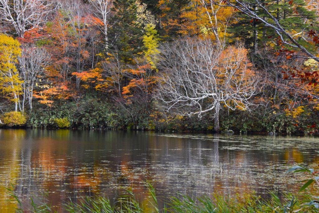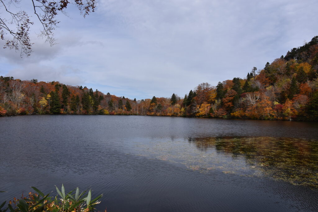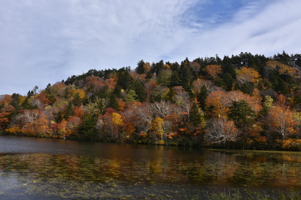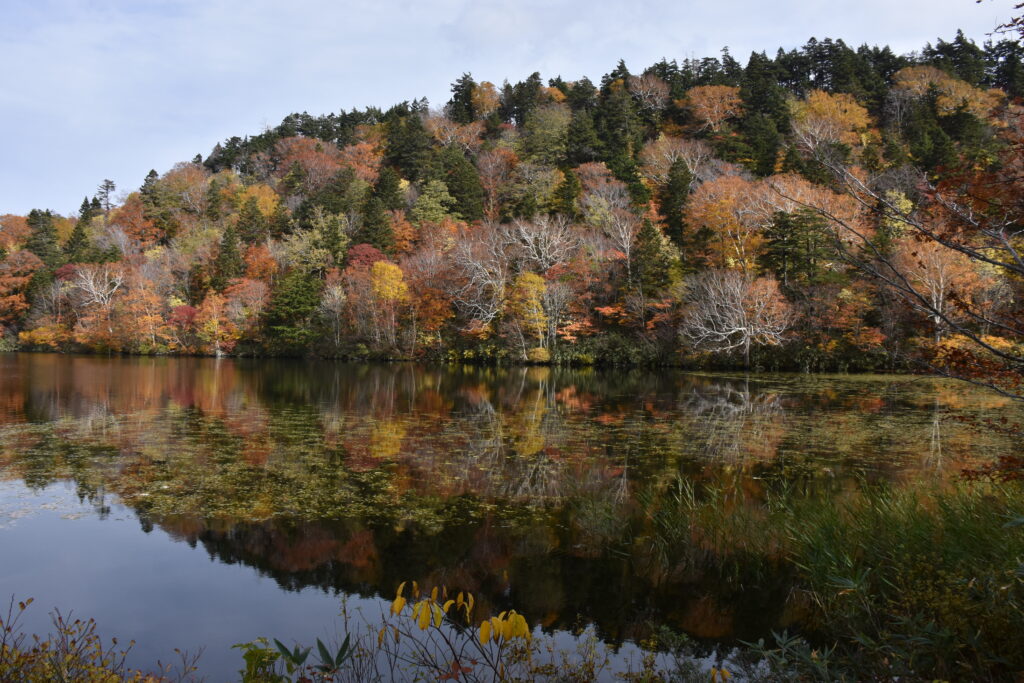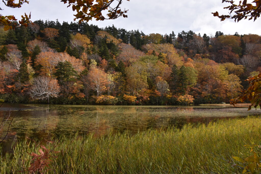 湿原を取り囲む山肌は、秋風が落とす絵の具で綺麗に染め上げられていました。