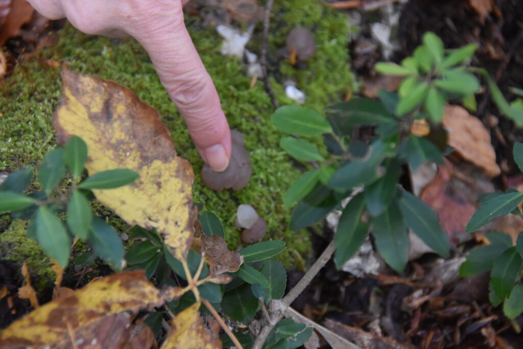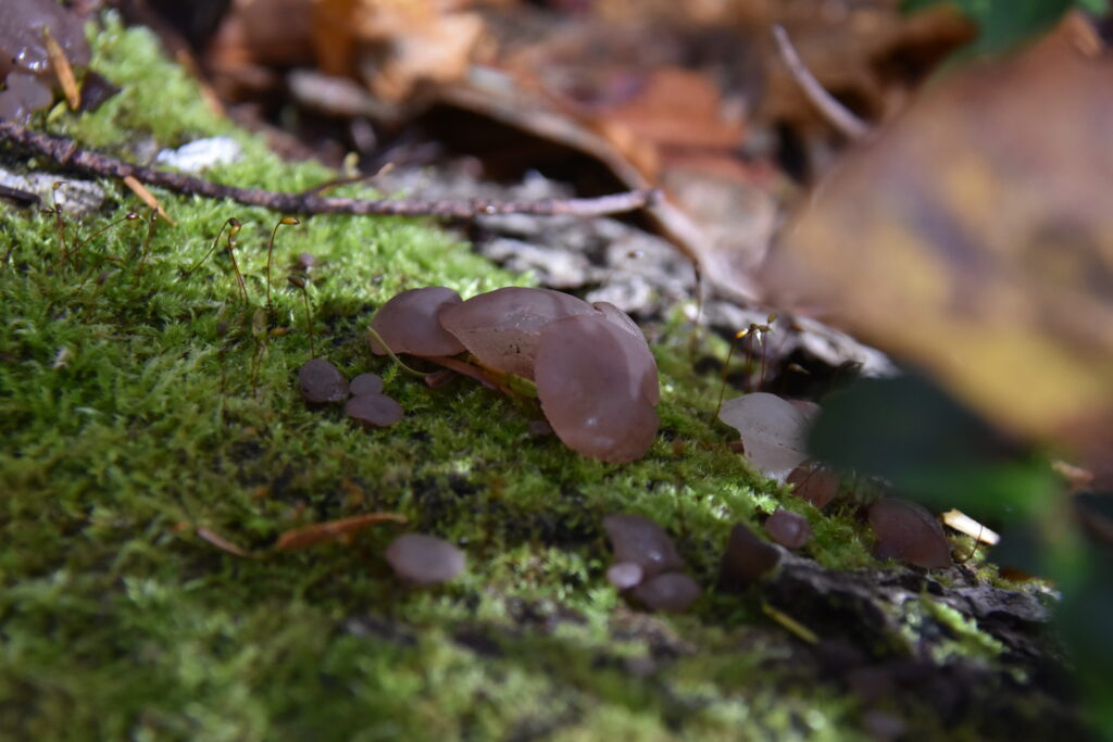 苔むした倒木に見つけたのはニセズキンタケ。