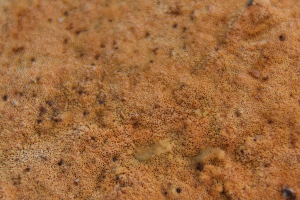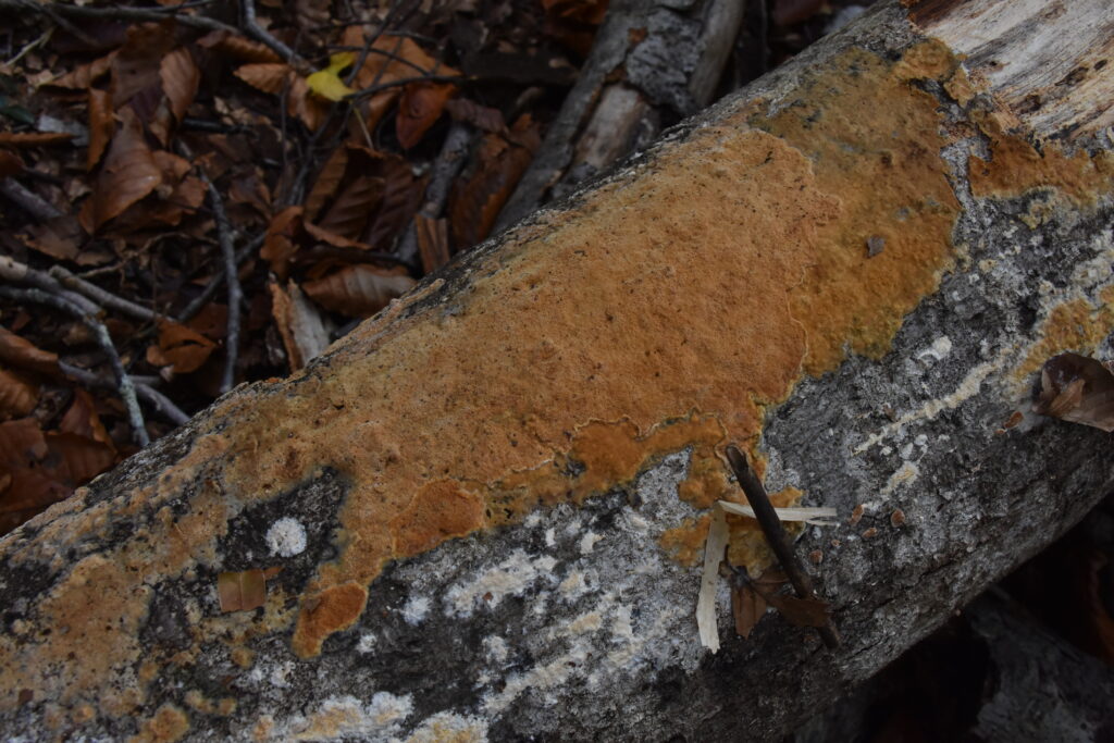 コウヤクタケの仲間みたいですが、虫眼鏡で覗いてみたらスポンジのように小さな穴がいっぱいです。