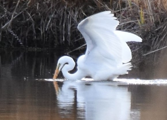 大沼に居ついているダイサギ、捕食失敗のように見えますが、何かを咥えているので、狩りに成功したようです。細い体のわりには大食漢でいっぱい食べます。