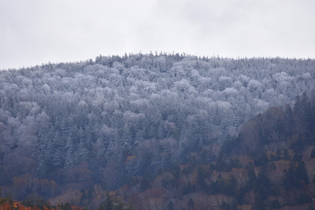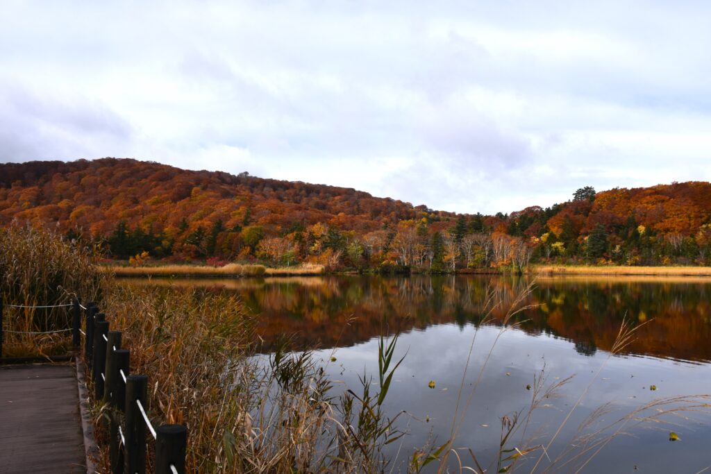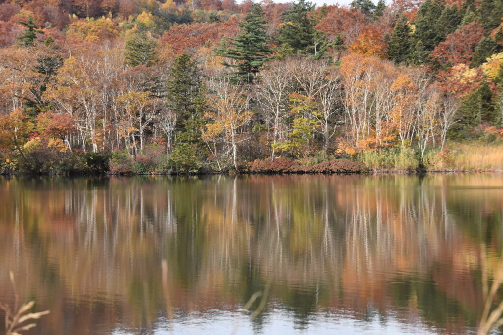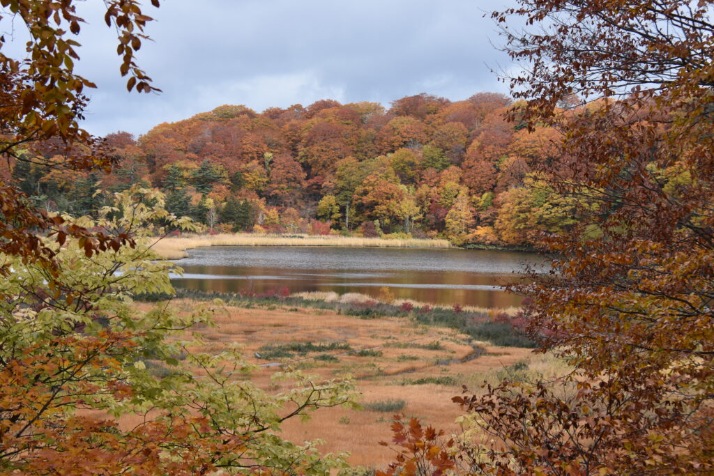 大沼南側からの景色です。今年は、強い風が吹かないのでブナの葉などが落ちずにいます。強い風が吹いたり霜が降りたりすれば一気に落葉が進み、駆け足で冬がやってきます。