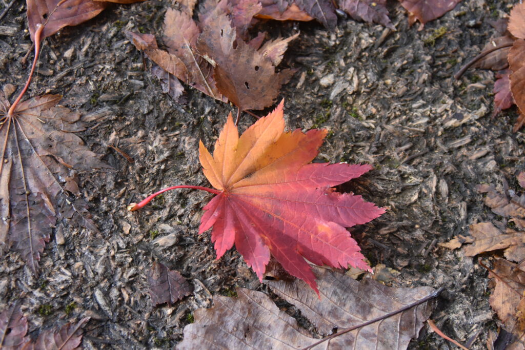 カサカサと音がする落ち葉の道を歩くのも楽しいもので早く色付いたカエデなどは、落葉してもなお、人の目を楽しませてくれます。