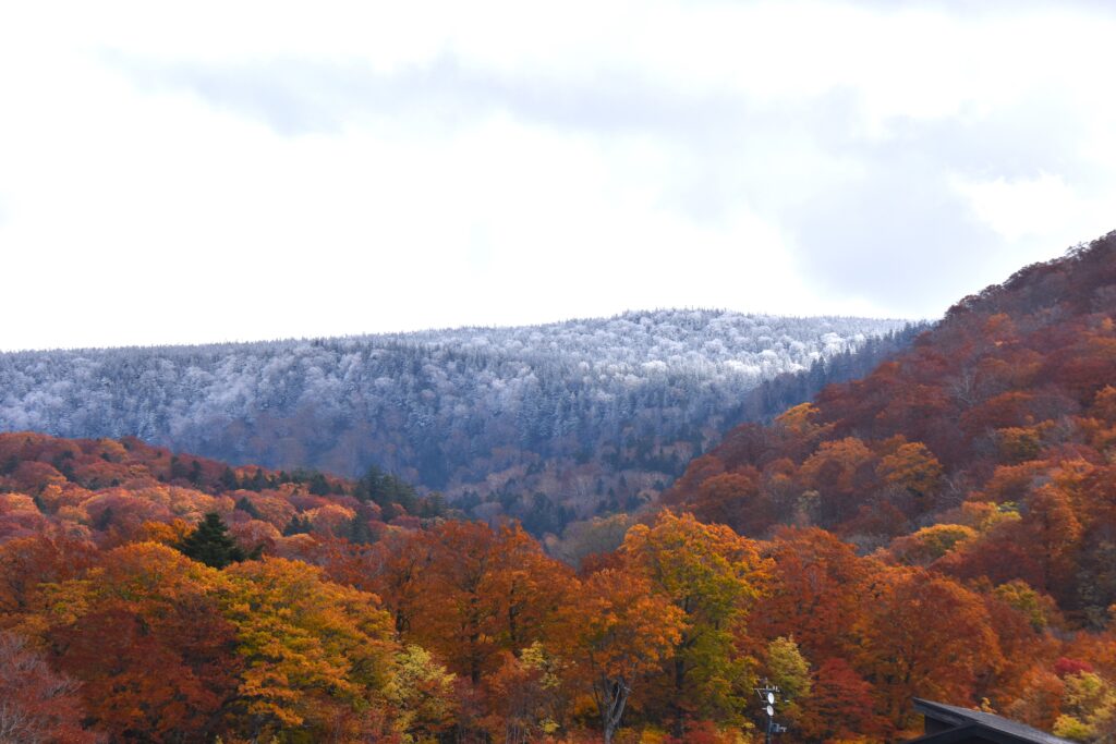 昨日、一昨日と八幡平山頂周辺に雪が降り新雪と紅葉のコントラストを大沼対岸から見ることが出来ました。
