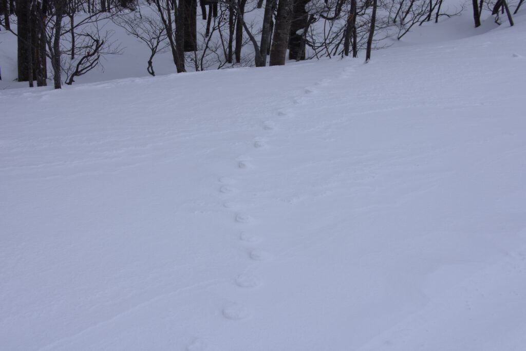 雪面に残されたキツネの足跡を追う様にブナ林の中へ。