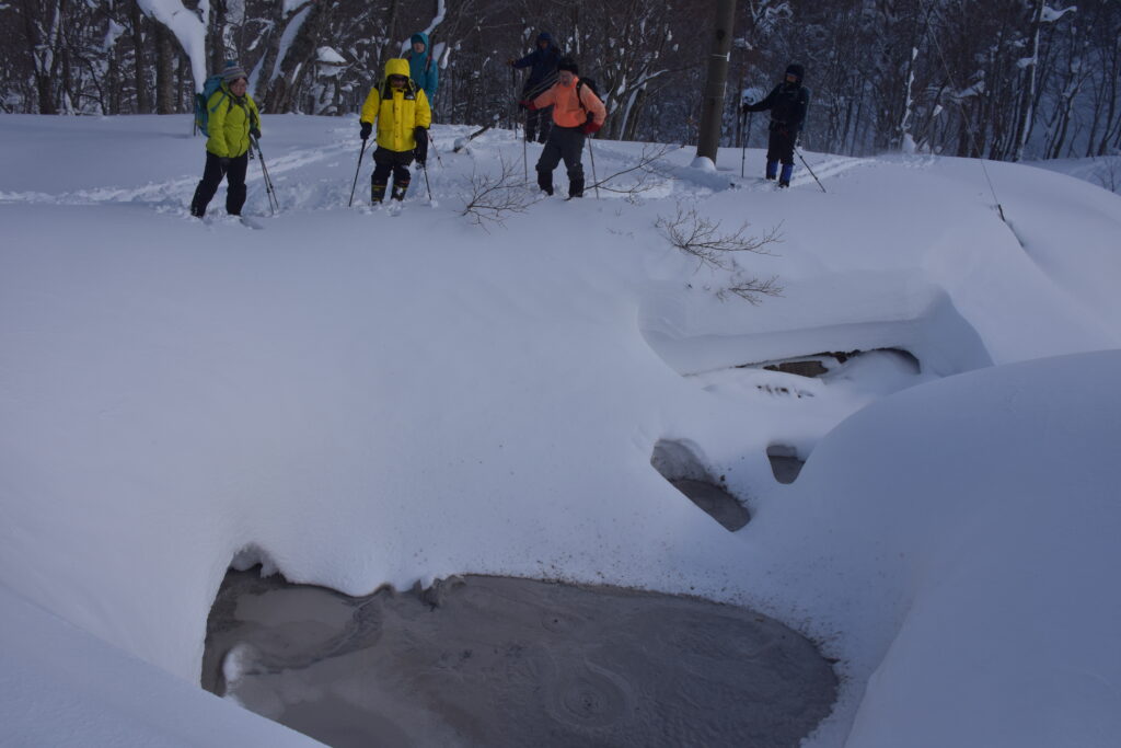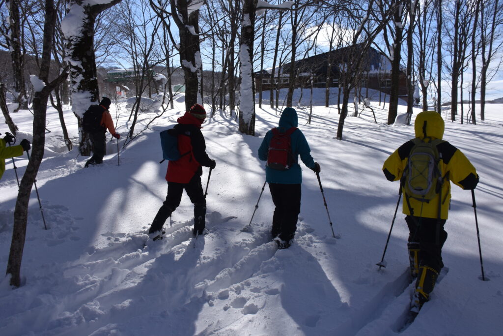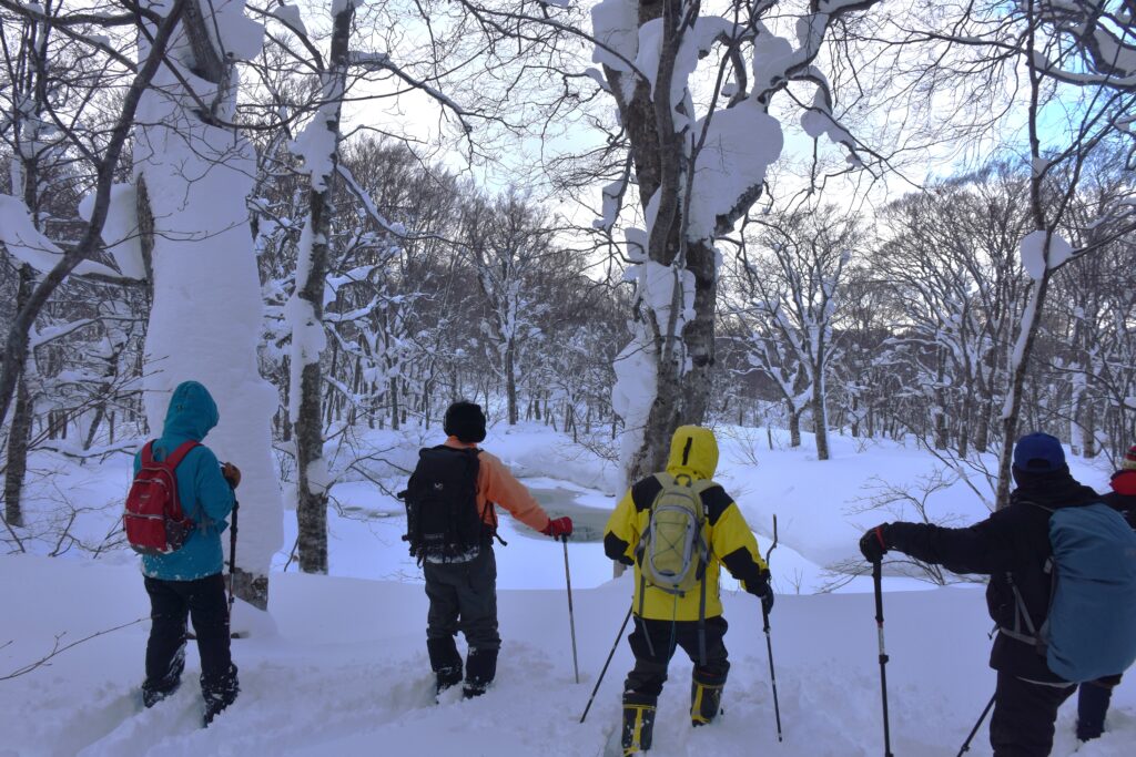 板の裏に滑り止めのついた短いスキーは、スノーシューよりも浮力が働くので深雪でも楽しめ、一歩が大きくなる上に斜面は滑って移動できる散策用らくちんアイテム。このスキーハイクを使って、雪の造形美と冬のブナ林の様子を観察、そしてふかふかの雪の感触を体感しに出発です。