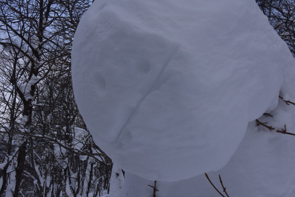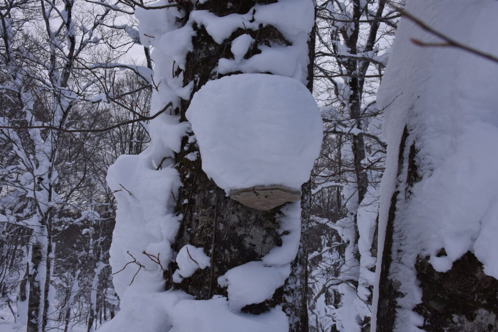 大きな雪帽子を載せたサルノコシカケの仲間、クジラタケを観察。