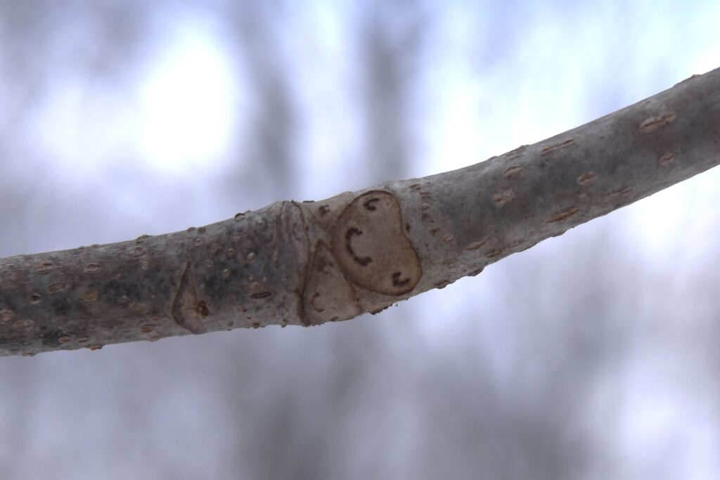 昨年のものではありませんが、ツキノワグマが木に登って実を食べる為に折った枝が樹上に棚のように引っ掛った食痕です。