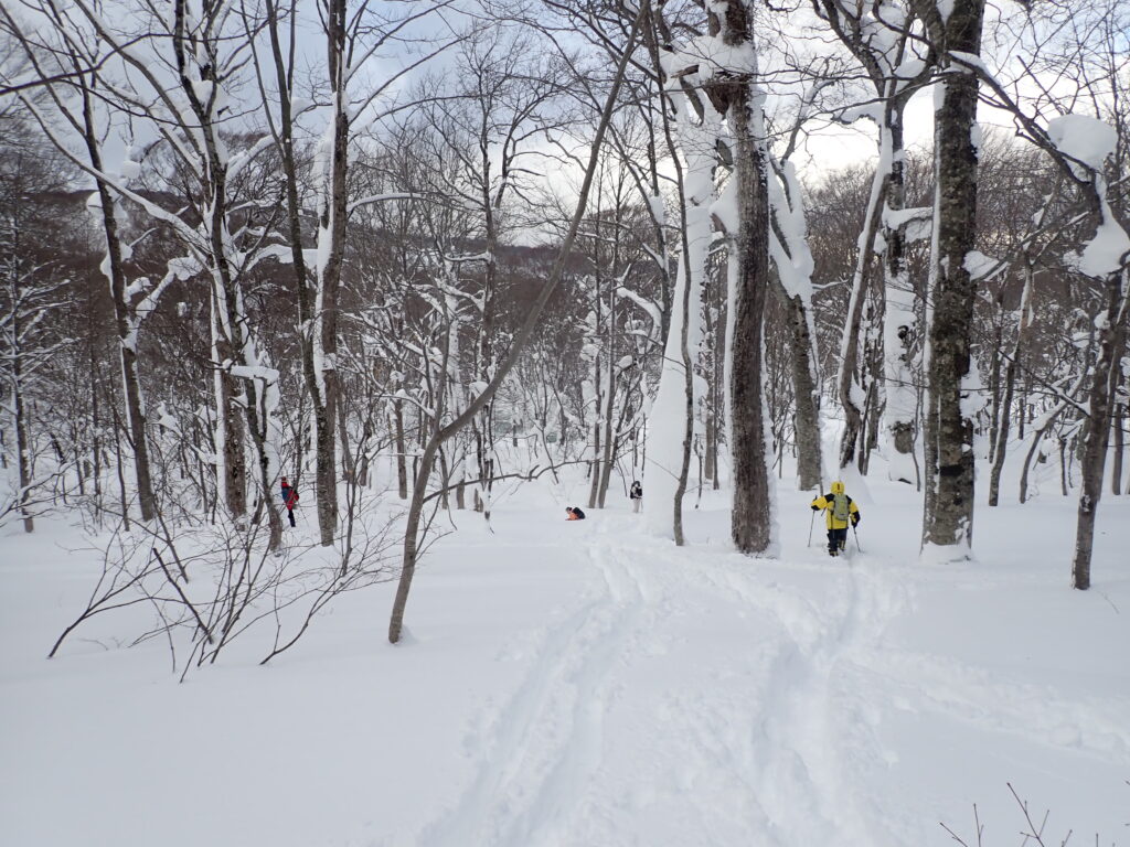 雪を纏った木々の間、緩い斜面を滑り降り…