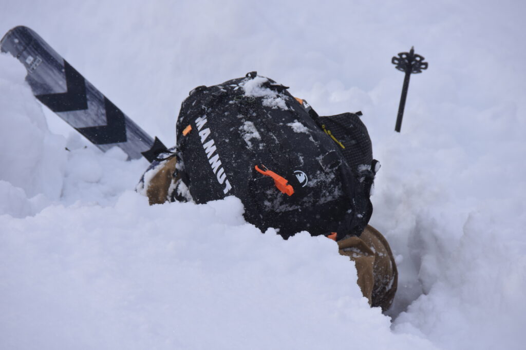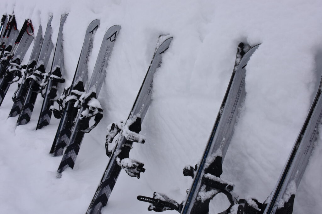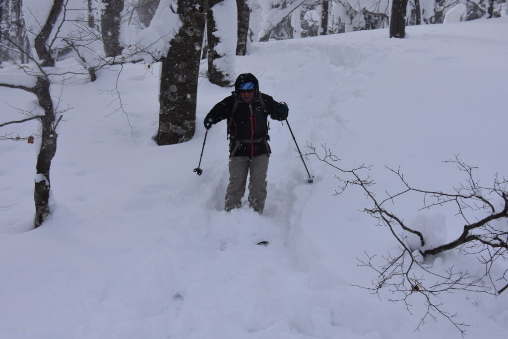 スノーシューより浮力のあるスキーハイクを使っても、サラサラの新雪は膝丈ほど。