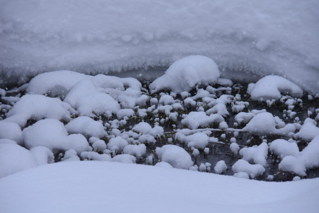 僅かながら水の流れのある場所には雪が積もらず、枯草などの上に載った雪の様子がモコモコと可愛らしく見えます。