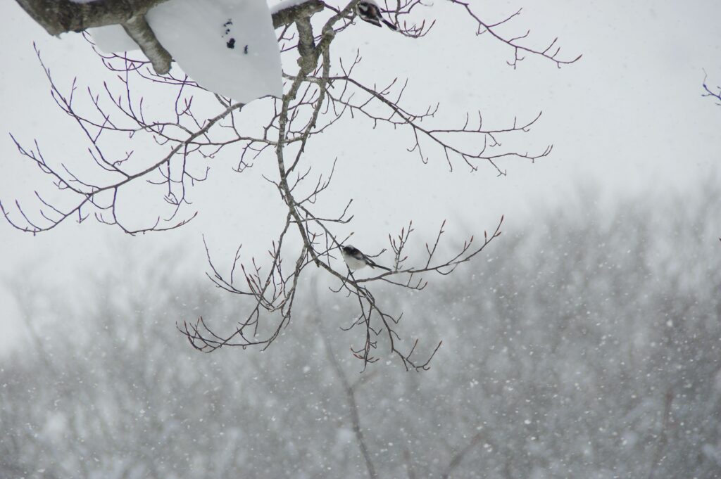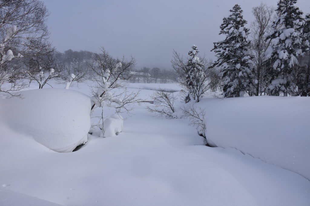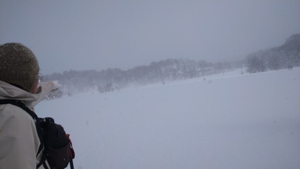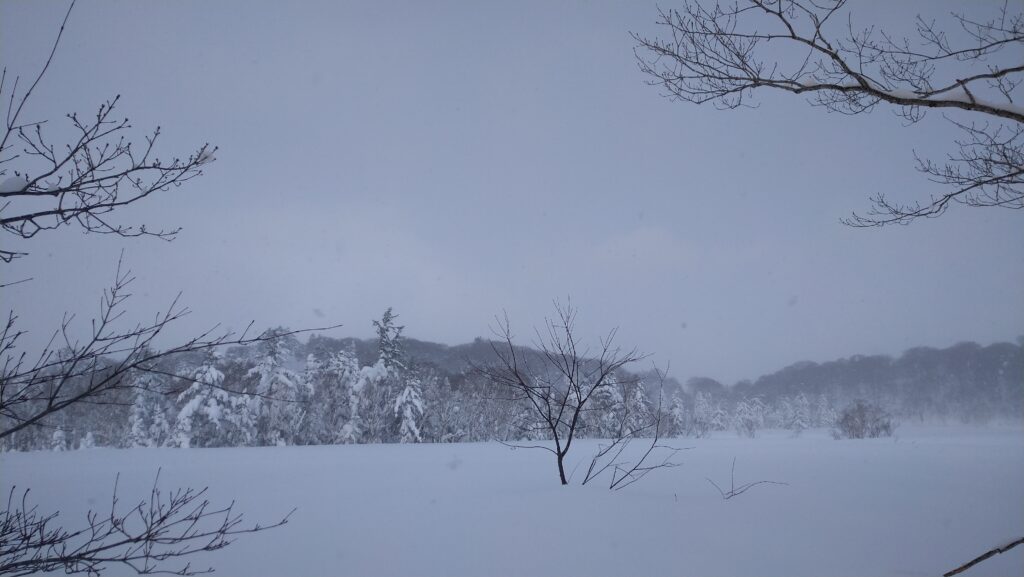 雪の舞う中、真っ白な大雪原へと姿を変えた大沼湿原へ。