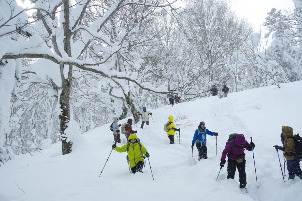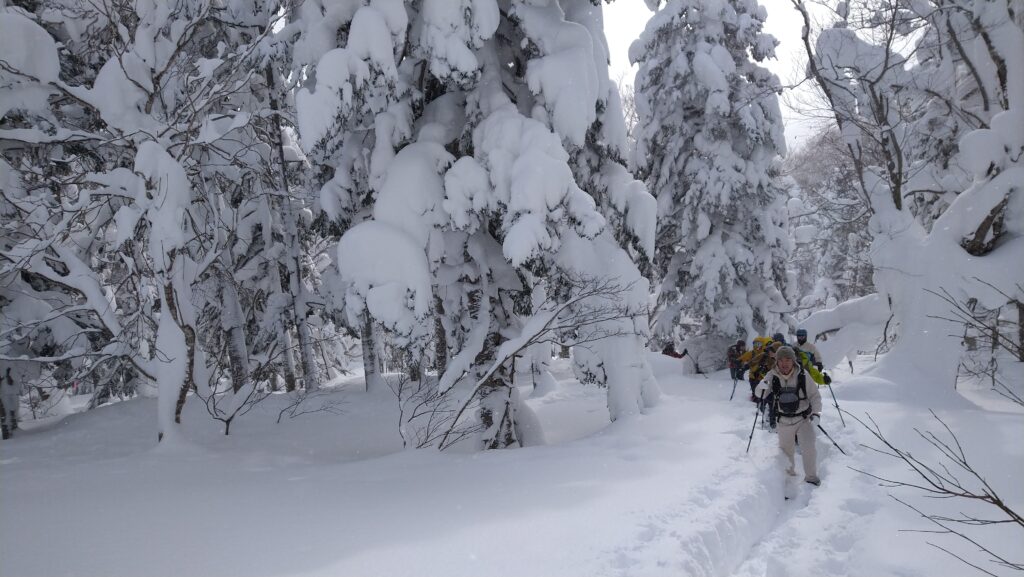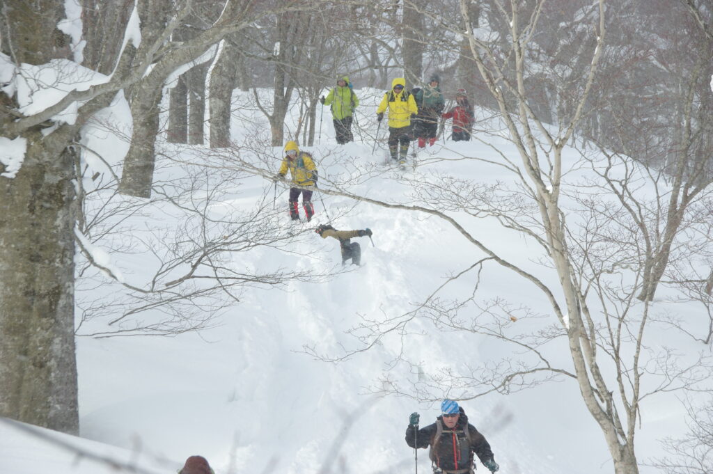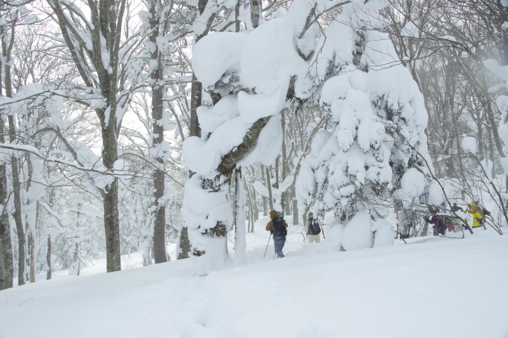 新雪が音を吸収しているはずですが、賑やかな声がブナ林の中に響き渡ります。