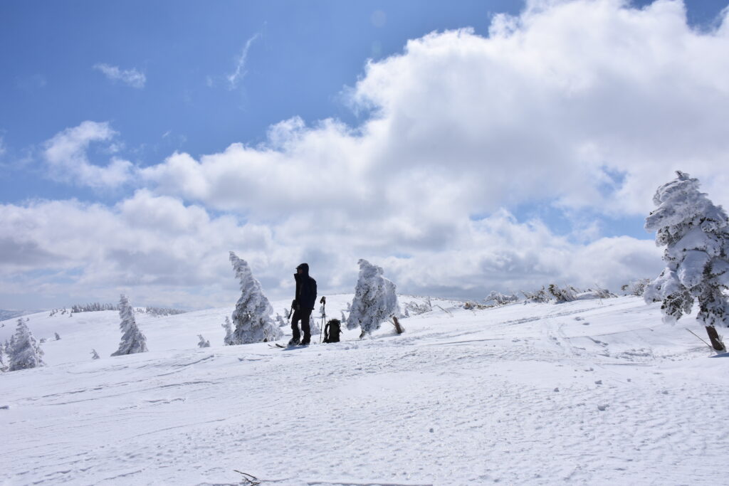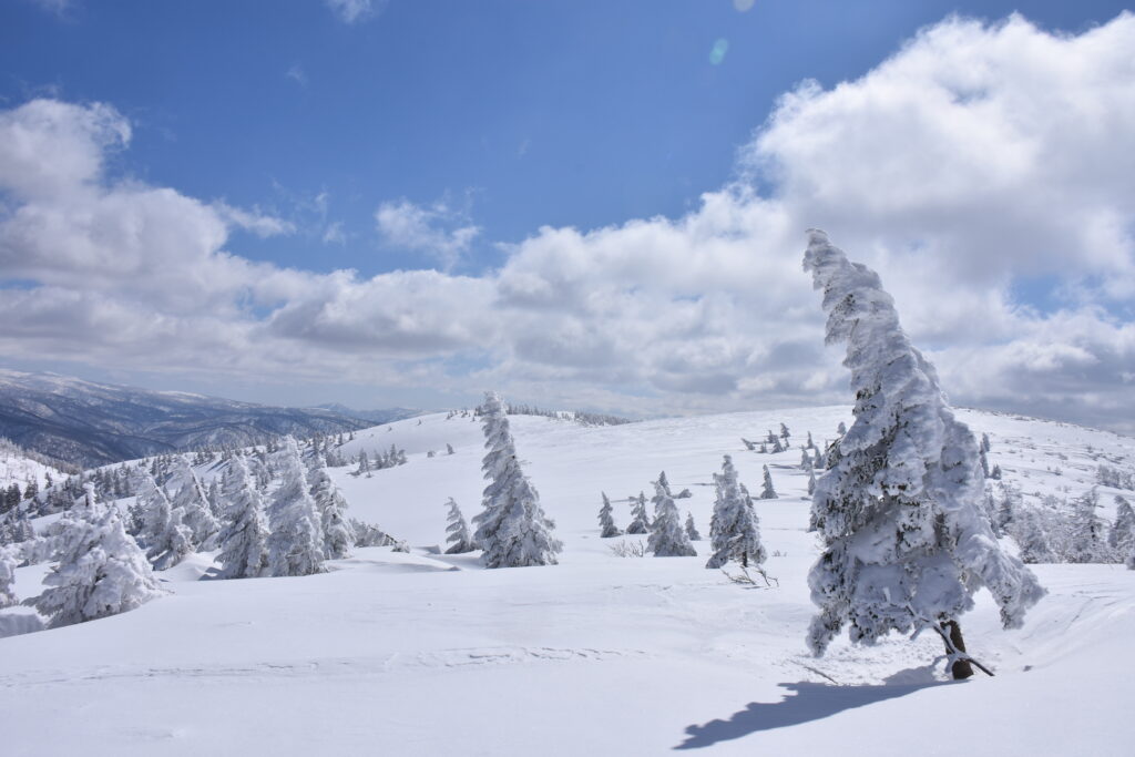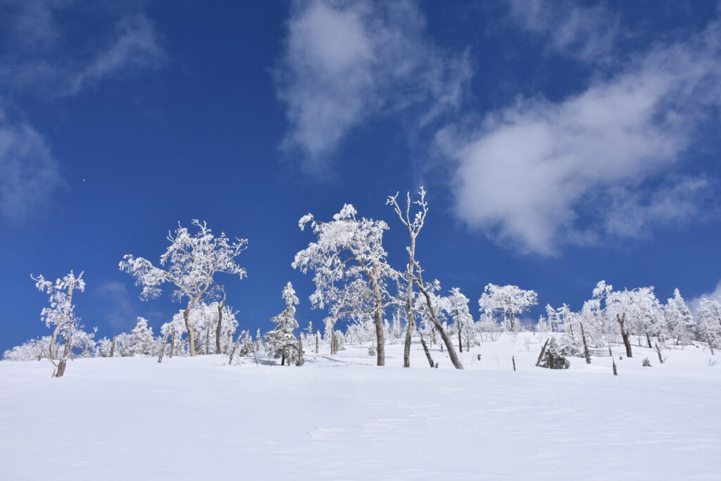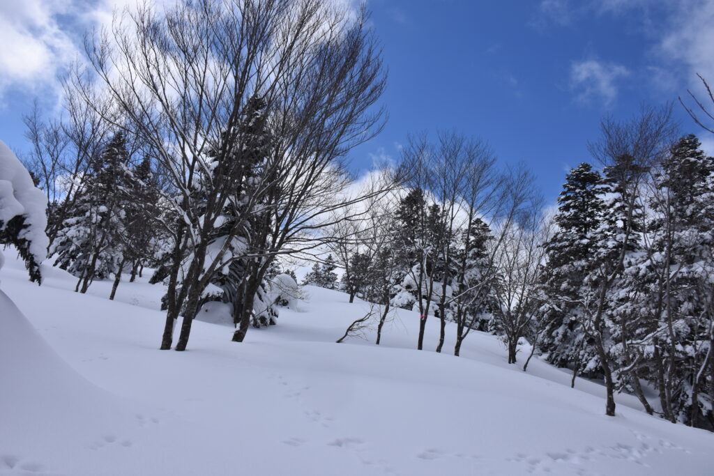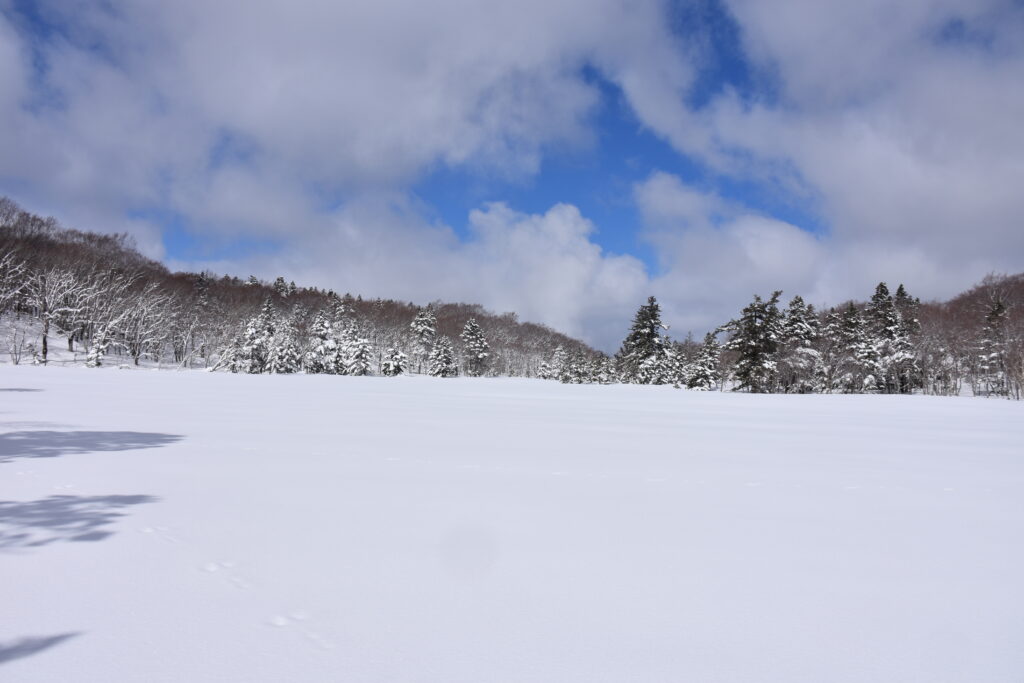 雪紐などの冬らしい光景も見ながら進むと、空が開けて目の前に広い雪原が姿を現しました。