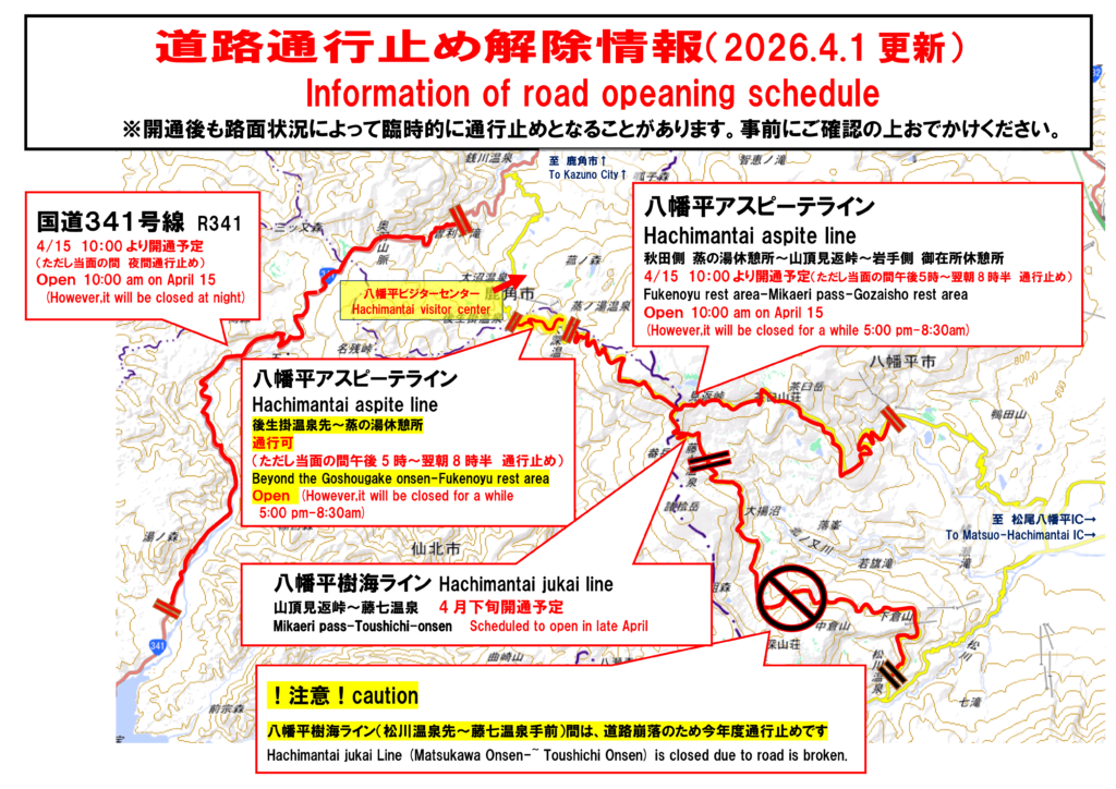 お出かけ前に、インターネットサイト「あきたのみち情報」や「八幡平市観光協会」などで最新の情報のご確認をお願いいたします。
