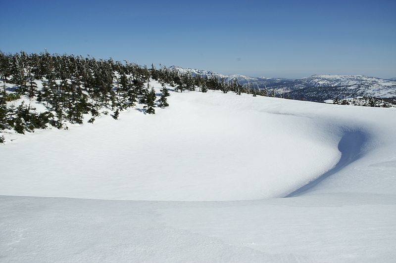 山頂散策ルートの竹竿道標設置作業時に見た鏡沼(ドラゴンアイ)の様子です。まだ「雪のくぼ地」の状態ですが、写真左側のオオシラビソの埋まり具合、写真右側の吹き溜まりの雪の量等を昨年と比較すると、今年は積雪少ない印象です。3月以降比較的天候が安定していたので雪解けが早く進んでいるのかもしれません。