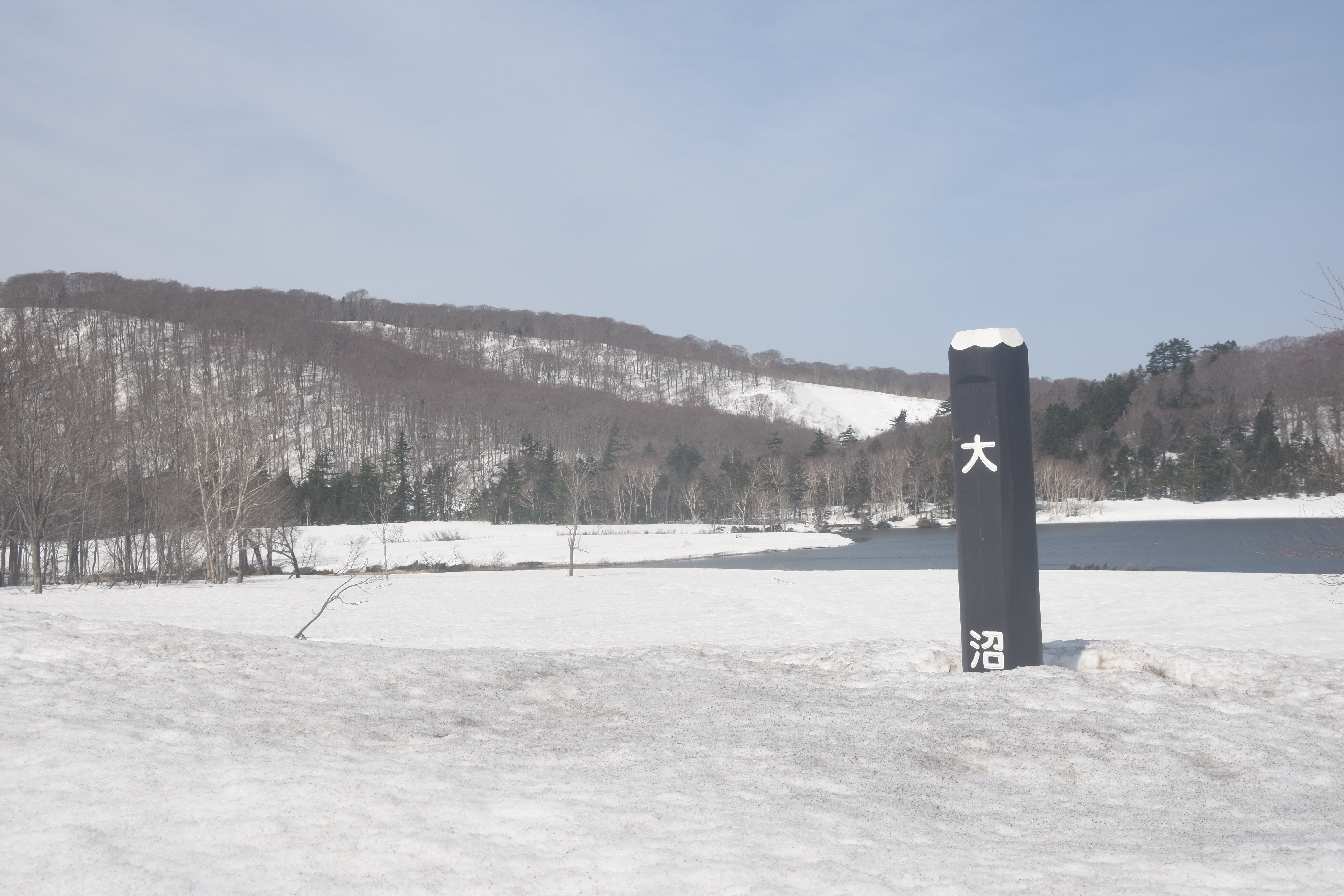 大沼は、道路沿いの積雪が登る必要がないほどに低くなりました。長靴や滑りにくい防寒靴であれば、沼の手前部分は散策が可能です。危険ですので沼岸には近づかないでください。また、沼の北側ブナ林の歩道は倒木のため立ち入り禁止としています。