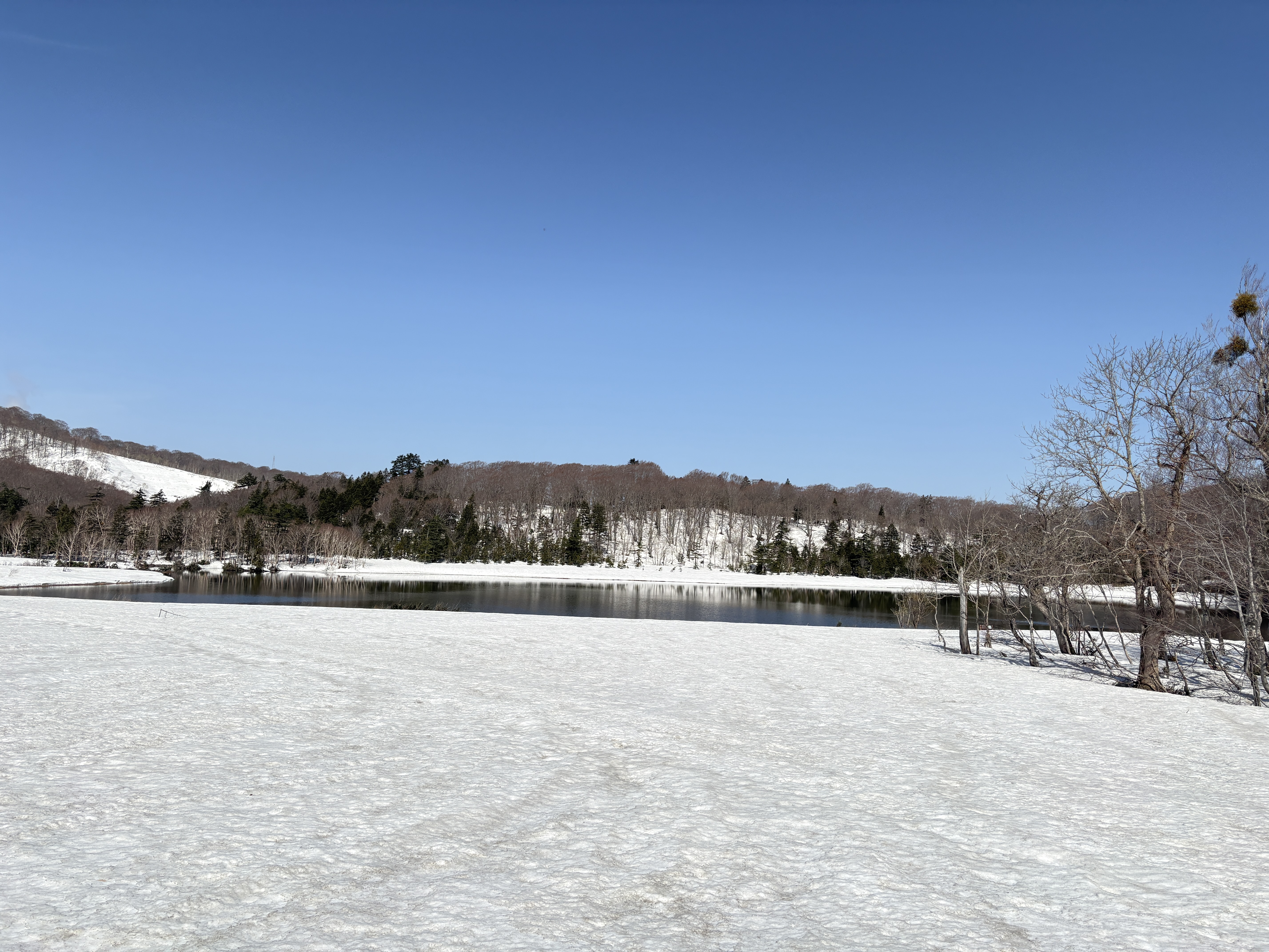 大沼は、長靴や滑りにくい防寒靴であれば、沼の手前部分は散策が可能です。沼岸や雪解けが進んでいる部分の縁は踏み抜きの危険がありますので近づかないでください。また、沼の北側ブナ林の歩道は倒木のため立ち入り禁止としています。