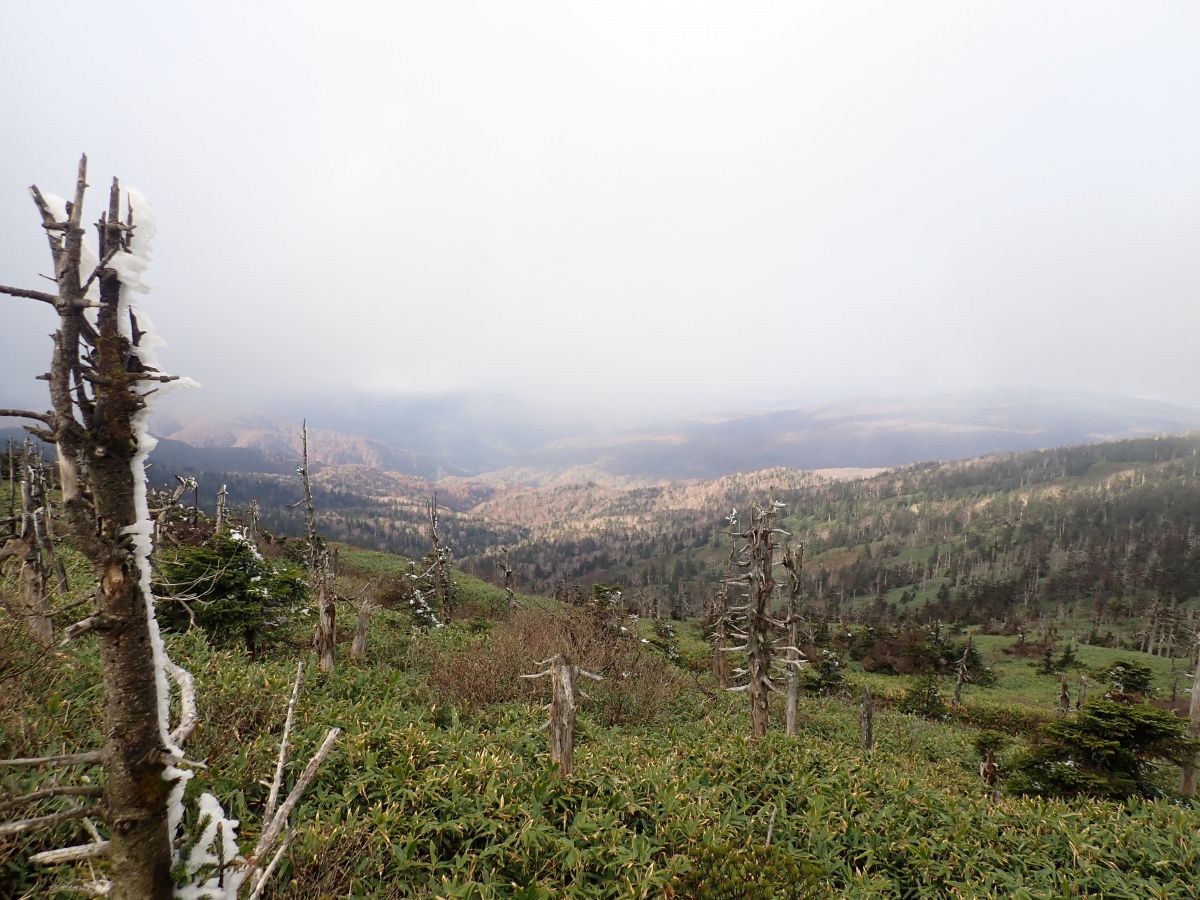 チラついていた雪も気にならなくなり、雲の切れ間に青空が覗いたり隠れたりする中、秋田八幡平スキー場のゲレンデ脇に立つ、クマ棚の掛かったブナの下から森の中へと入っていきます。